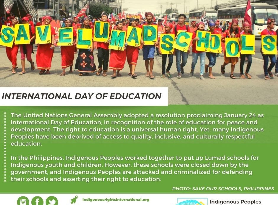 The United Nations General Assembly adopted a resolution proclaiming January 24 as International Day of Education, in recognition of the role of education for peace and development. The right to education is a universal human right. Yet, many Indigenous Peoples have been deprived of access to quality, inclusive, and culturally respectful education.