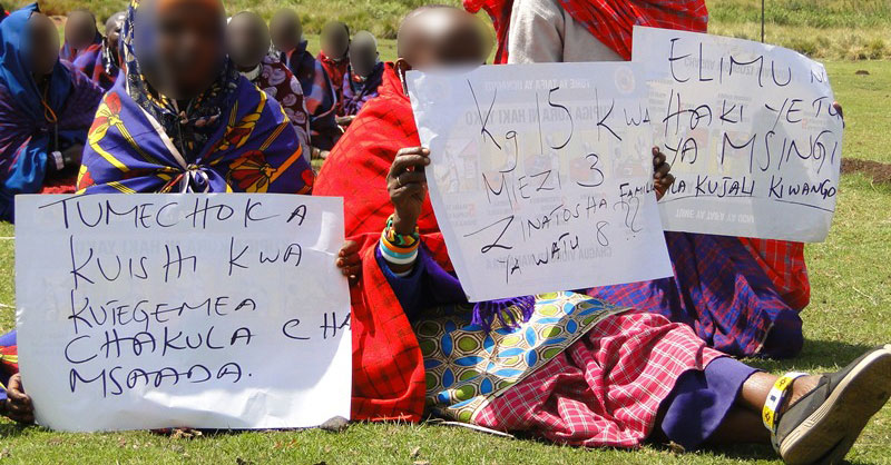 Watu wa Asili huko Ngorongoro, Tanzania wanapinga na mabango yakisema (kutoka kushoto kwenda kulia), “Tumechoka kuishi na kutegemea chakula cha misaada;” “Kilo 15 za nafaka kwa miezi mitatu kwa watu 8;” na “Elimu ni haki yetu.”