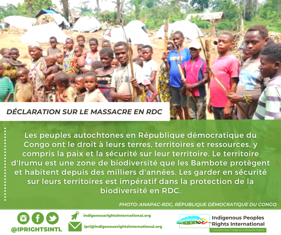 Nous, Indigenous Peoples’ Rights International (IPRI) et l’Alliance Nationale d’Appui et de Promotion des Aires et Territoires du Patrimoine Autochtone et Communautaire (ANAPAC-RDC), dénonçons fermement le massacre impitoyable de 46 personnes autochtones Bambote du territoire d’Irumu, dont 36 femmes et filles, parmi lesquelles 15 sont des enfants dont l’âge varie entre 3 mois à 16 ans, dans la province de l’Ituri, République Démocratique du Congo, le 14 janvier 2021.