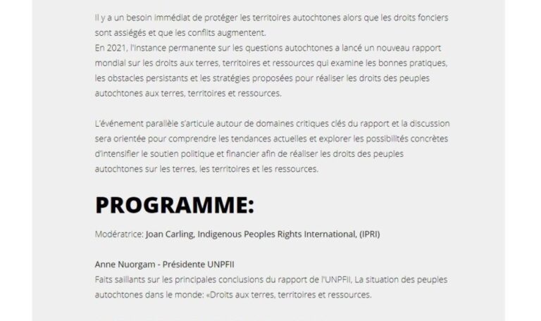 Contexte Indigenous Peoples Rights International (IPRI) organise l’événement parallèle « La Criminalisation des Peuples Autochtones et leur droit à l’Autodétermination ». L’événement parallèle aura lieu lors de la 14e session du Mécanisme d’Experts sur les Droits des Peuples Autochtones (EMRIP)…